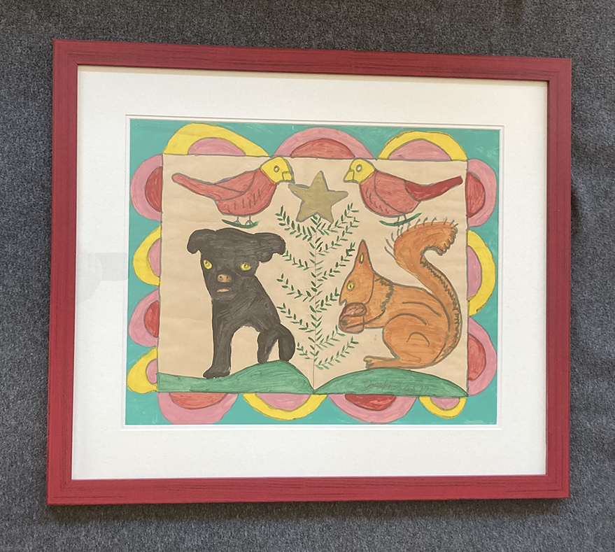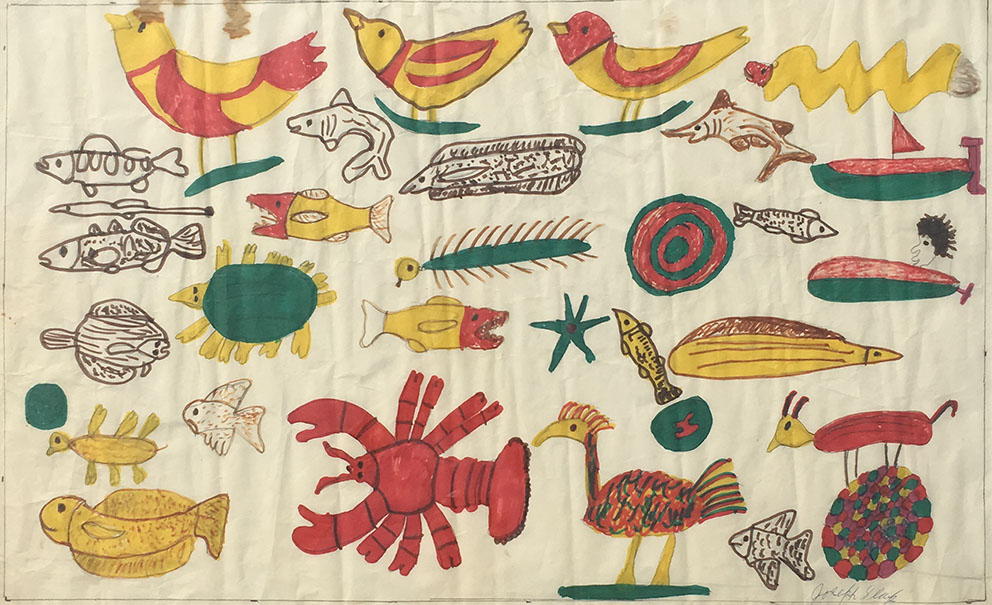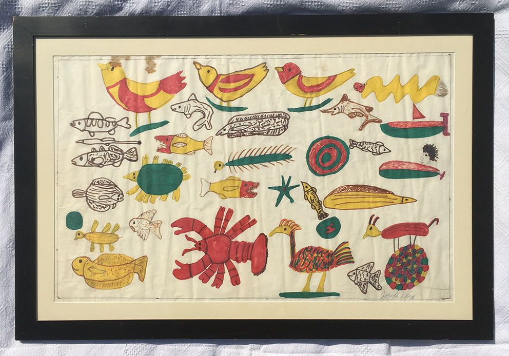 Joe Sleep used many materials in his folk art - latex, cardboard, canvas, and masonite, felt markers, pen, pencil, ballpoint and even spray paint. Some paintings are "suitcase" size (that could be easily packed by tourists) and others are monumental compositions painted on panels eight feet in length. Joseph Sleep died in 1978.